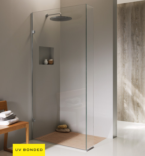 Choose how to attach your return panel by selecting from a minimal UV bonded finish or a pair of elegant glass to glass brackets.
